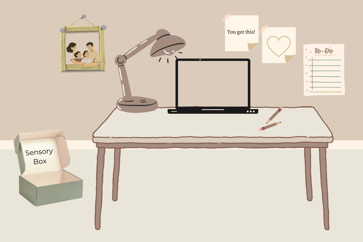Place a Sensory Toolkit or other items that help relieve anxiety within arm's reach from your desk so you can reach for them if needed. (fidgets, stress balls, stuffed animals, a favorite blanket, etc.)